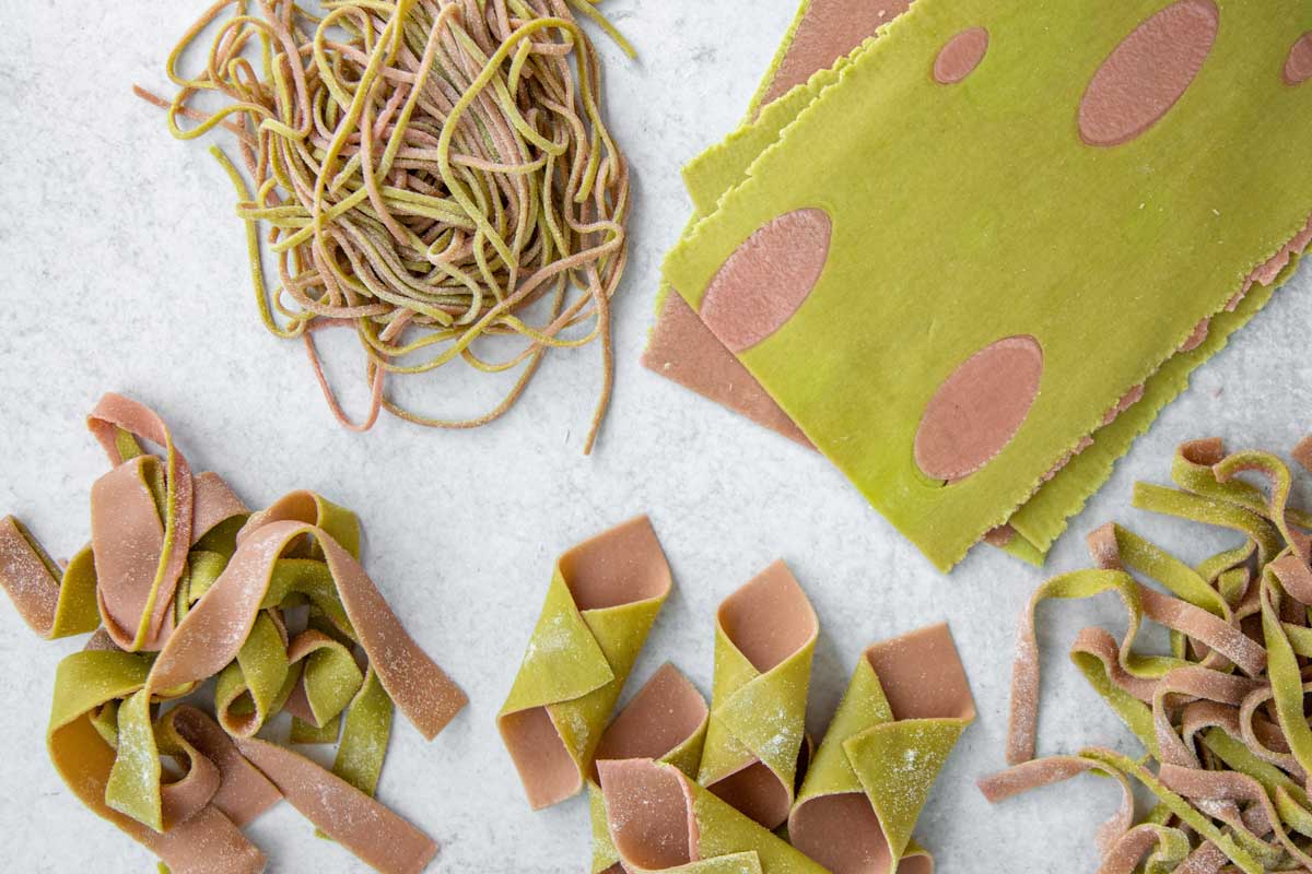 There are thousands of ways to express your culinary artistry through pasta, and one of the most fun methods is to color the dough with natural ingredients like beets, spinach, turmeric, and more. These ingredients won’t add much flavor to the pasta, but they provide lots of vibrant color. (Keep in mind the colors of the pasta may lighten slightly when you cook it.)