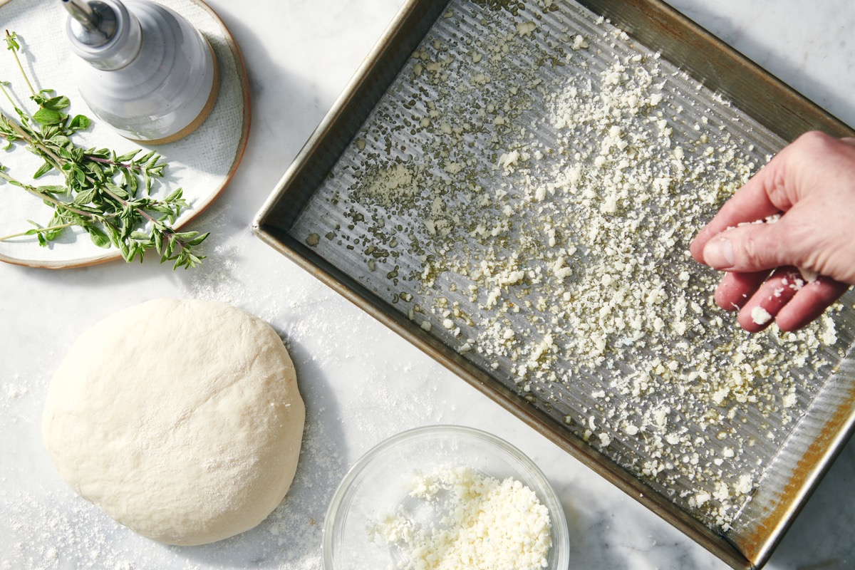 Award-winning author Joshua McFadden suggests just this in his newest book, Grains for Every Season. (Heads up: At King Arthur, we only recommend the products that we, as bakers, truly love. When you buy through external links on our site, we may earn an affiliate commission.) McFadden notes that he regularly scatters a thin layer of Parmigiano-Reggiano cheese in the bottom of his half-sheet pan before pressing in the pizza dough. Once baked, the cheese partially caramelizes, crisps, and adds another layer of both flavor and texture to his finished pizza.