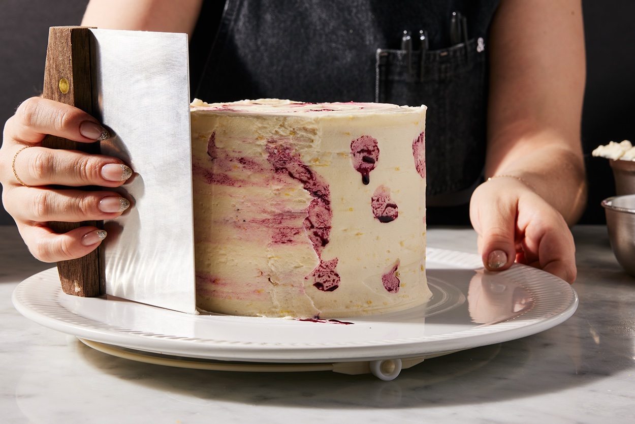 While a microwave ring doesn’t elevate your cake as high off the counter as some turntables, it spins easily, allowing you to rotate your cake while you smooth on the frosting. An offset spatula or bench knife is another handy tool; hold the spatula or bench knife at a 45-degree angle against the side of the cake, then turn the makeshift turntable to smooth out the frosting. (For more tips on how to frost your cakes like a pro, check out this video, How to Frost a Cake.)