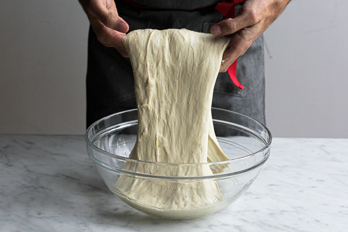 Folding typically involves folding sections of the dough over itself throughout bulk fermentation; there are several different methods, which I describe in greater detail below. It’s gentler than kneading, but is done for the same reason: Folding helps strengthen the gluten network, allowing the short chains of gluten to link up into longer strands, resulting in a dough that’s more extensible and therefore better able to trap the gases expelled by yeast. During the kneading or folding process, the dough transforms from a shaggy mass into a smooth, elastic dough.