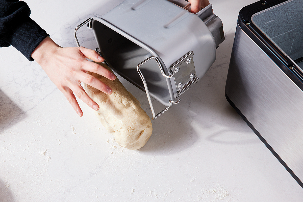 Baker’s tip: When you pause the machine to shape your loaf, you can also remove the paddles from the pan; there will still be small holes in the bottom of the baked loaf, but they’ll be much less of an eyesore. But beware that the exposed paddle-holders aren’t coated in nonstick lining, so to prevent sticking, lightly grease the two little rods with butter or nonstick spray before returning the dough to the pan.