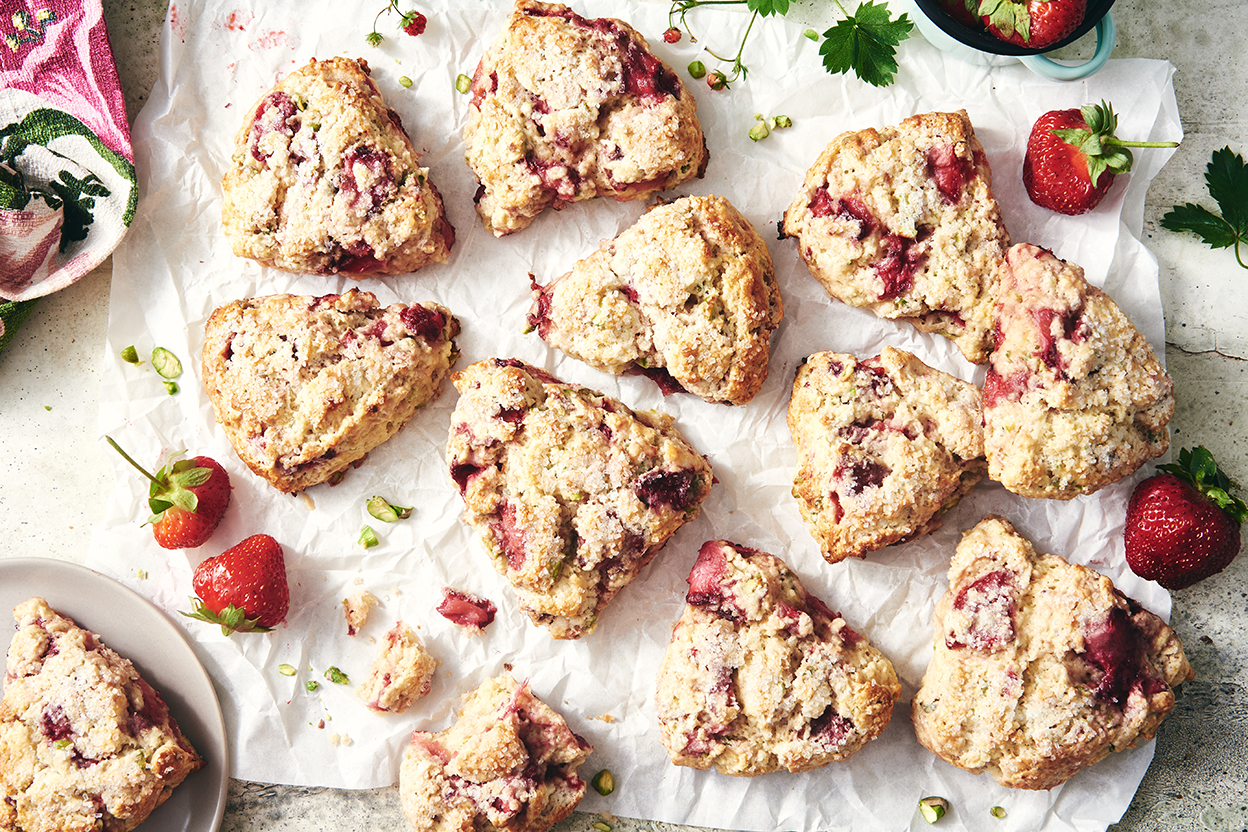 Cover photo (Roasted Strawberry and Pistachio Scones) and food styling by Liz Neily.