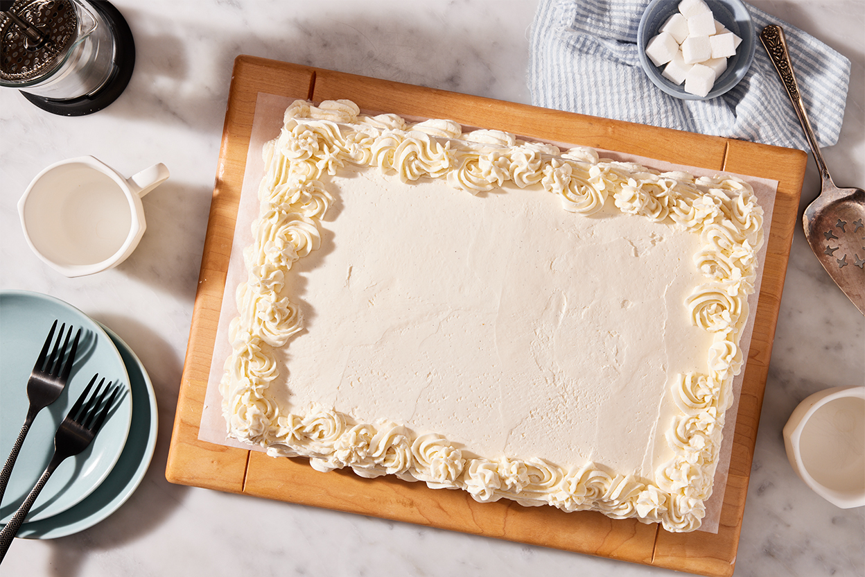 The basic building blocks of a sheet pan layer cake are the same as any other: cake, filling, and frosting. And technically the process is also the same: stack, fill, and frost. But Senior Recipe Developer Molly Marzalek-Kelly, who developed this recipe, knows this giant cake can look daunting, and she stresses that if you’ve made a round layer cake before, you can make this. (In fact, you can do so without some of the specialty tools necessary for decorating round layer cakes, like a turntable or cake rings.) Molly developed this recipe to be as approachable as possible, and here are her key tips to ensure slab cake success.