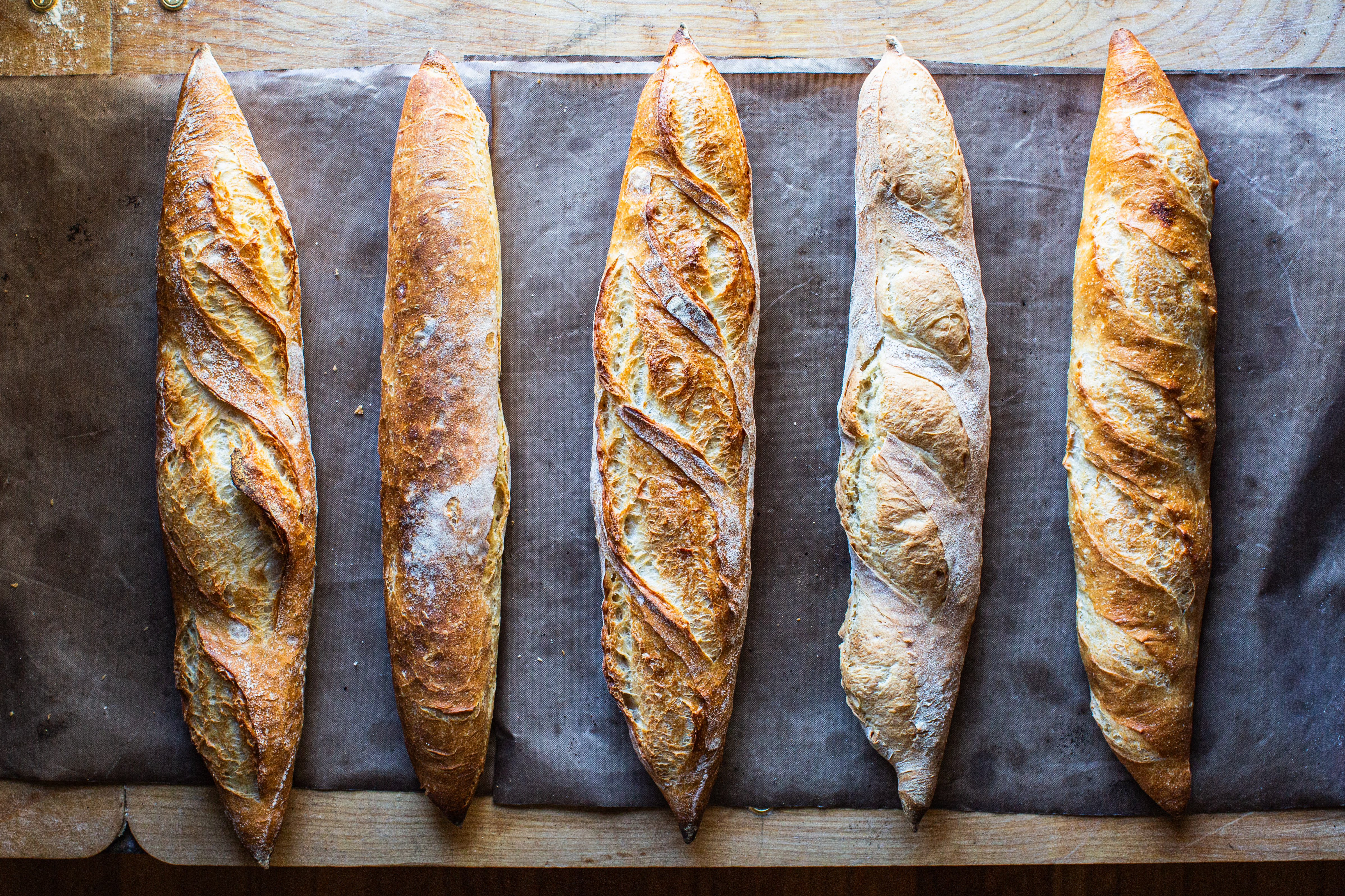 We also want to place the cuts where they matter most. Placement depends on the shape of the loaf: With boules (round loaves), you want the cut to be symmetrical, evenly releasing the loaf in all directions. For baguettes, it should be a series of five to seven symmetrical cuts, evenly distributed along the midline of the baguette and overlapping by roughly a third. For bâtards, one cut running lengthwise down the middle of the loaf is a great place to start.