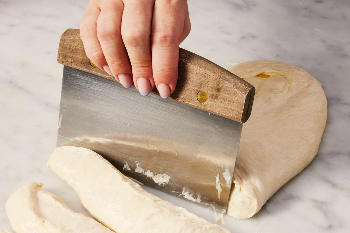 The chop-and-plop method is most useful when working with high-hydration doughs. Doughs are generally considered to have high hydration when the percentage of liquid to flour in a recipe is about 80% or higher. Take this ciabatta recipe as an example; its hydration is 79.5% (close enough to qualify). As expected, the dough is wet and sticky, so the recipe includes 7 minutes of beating in a stand mixer to achieve a smooth, elastic dough. The same outcome could be achieved using the chop-and-plop method instead, which is a great workaround if you don’t own a stand mixer. The only tool you need is a bench knife.
