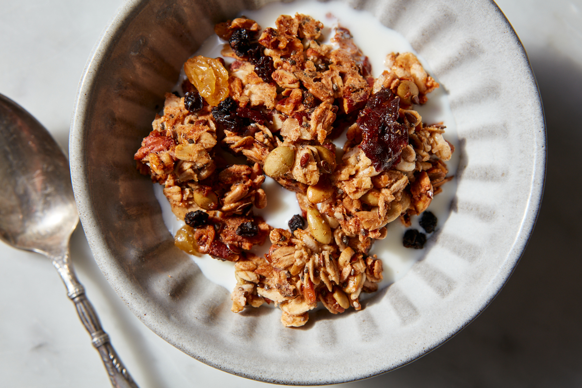 For effective cohesion without any textural downsides, adding all-purpose flour was the winner. It helped to bind the oats and nuts together effectively, leaving behind heaps of crunchy granola clusters that stood straight up in a bowl. Adding flour to the dry ingredients should work with most granola recipes. Start by adding about 1/4 cup (30g) all-purpose flour per 3 1/2 cups (312g) of old-fashioned oats, and experiment until you find your preferred ratio.