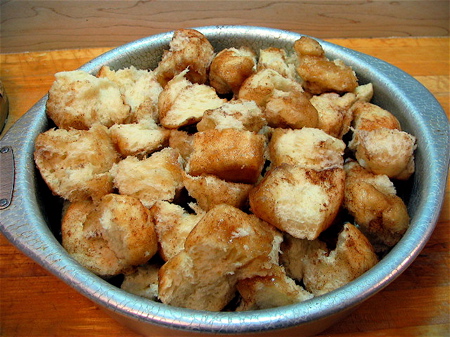 So, you have two pans of Cinna-Bites here. Enjoy one warm, and save the other for later; to reheat, wrap loosely in aluminum foil, and heat for about 10 minutes in a 350°F oven. Or make the most comforting of all nursery foods: Cinna-Bite Bread Pudding. The recipe is at the end of the Cinna-Bites recipe.