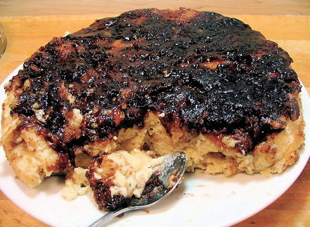 Just like you did when you made the monkey bread, loosen the edges, and IMMEDIATELY turn the pudding out of the pan onto a serving plate. Notice the gooey, cinnamon-y crust the cinnamon filling and chips made as the pudding baked.