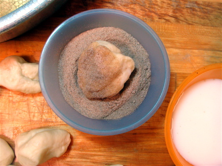 Each piece of dough gets dipped in milk, then in cinnamon sugar or Baker's Cinnamon Filling, which includes cinnamon, sugar, and another kind of sugar to make it gooey when it melts. YUM. Notice the pieces are irregularly shaped. There's absolutely no need to round them into balls, though if you're someone who loves doing fancy stuff like that, go for it.