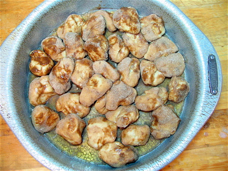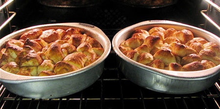 Grease two 9” round cake pans, pour in a layer of maple syrup or cinnamon syrup, and put 32 pieces of dough in each.