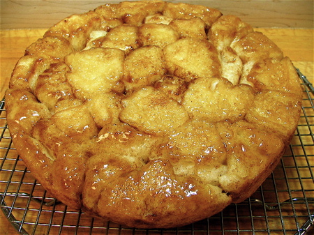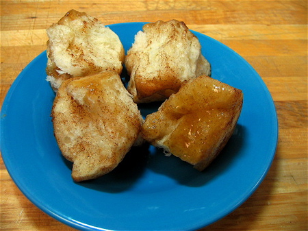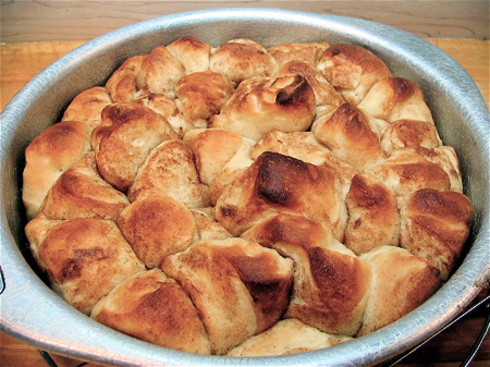 So–since that bathtub of rising dough has put us all in the mood for some comfort, let’s make monkey bread. This pull-apart bread, a ’50s classic, doesn’t require any serious skill at all. But hot from the oven, smelling of butter and cinnamon, daring you to wait till it’s cool enough so you don’t burn your fingers pulling it apart–well, it just doesn’t get any better. My favorite recipe for monkey bread is Cinna-Bites. Here’s a visual how-to: