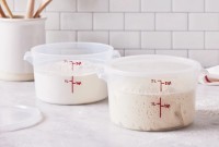 If you want to feed and store your sourdough starter in the same container, you want one that’s large enough to hold triple your volume of starter, to allow room for it to grow. It’s handy to use a clear glass or translucent plastic container, so you can track its progress. (Our glass sourdough crock is a preferred option.) Stoneware, plastic, stainless steel, and enameled metal are also suitable materials. Read more.