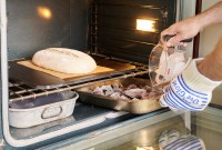 When flour and water are mixed together, enzymes break down the complex carbohydrates in flour and turn them into simple sugars. Yeast feeds on these simple sugars and produces carbon dioxide bubbles. Bread dough traps the bubbles, causing it to expand. When you put a sourdough loaf into the oven, the yeast dies, but the carbon dioxide remains trapped within the dough, producing beautifully risen bread. Watch a video.