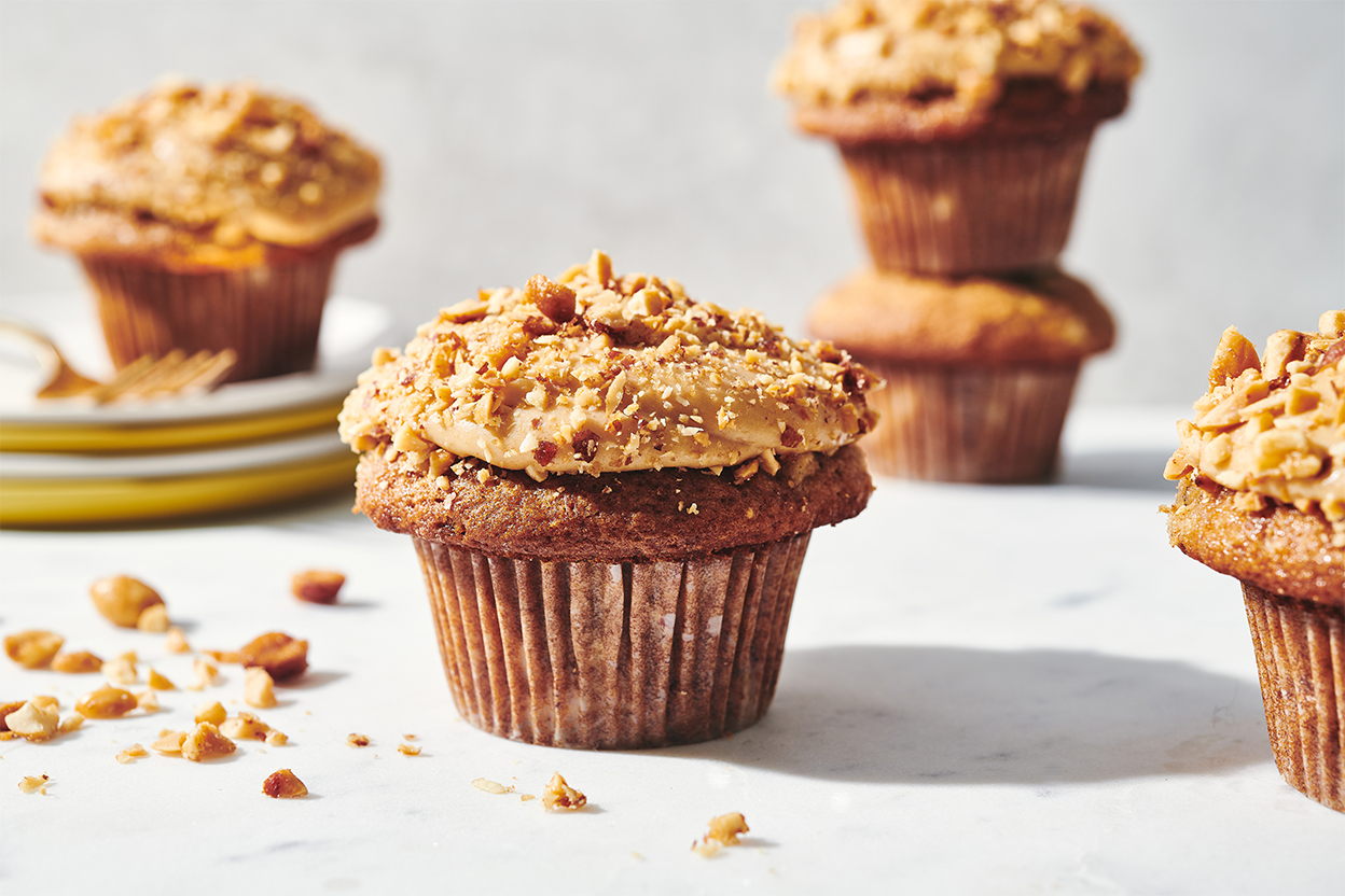 Who doesn't love a PB & B sandwich? This classic flavor combo makes a great cupcake: moist banana cake, peanut butter frosting, and a blizzard of crushed salty/sweet honey roasted peanuts on top. To make as a layer cake see the bakers' tip at the bottom of the recipe.