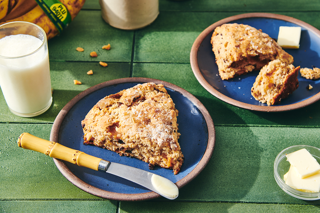 These banana scones, formerly known as banoffee scones, embody the banana-toffee flavor combination made popular by a sweet English pie of the same name. Our salty-sweet toffee crunch add-in has inspired us to experiment with this duo of flavors, and this banana scone was one of our favorite ways to enjoy the pairing.