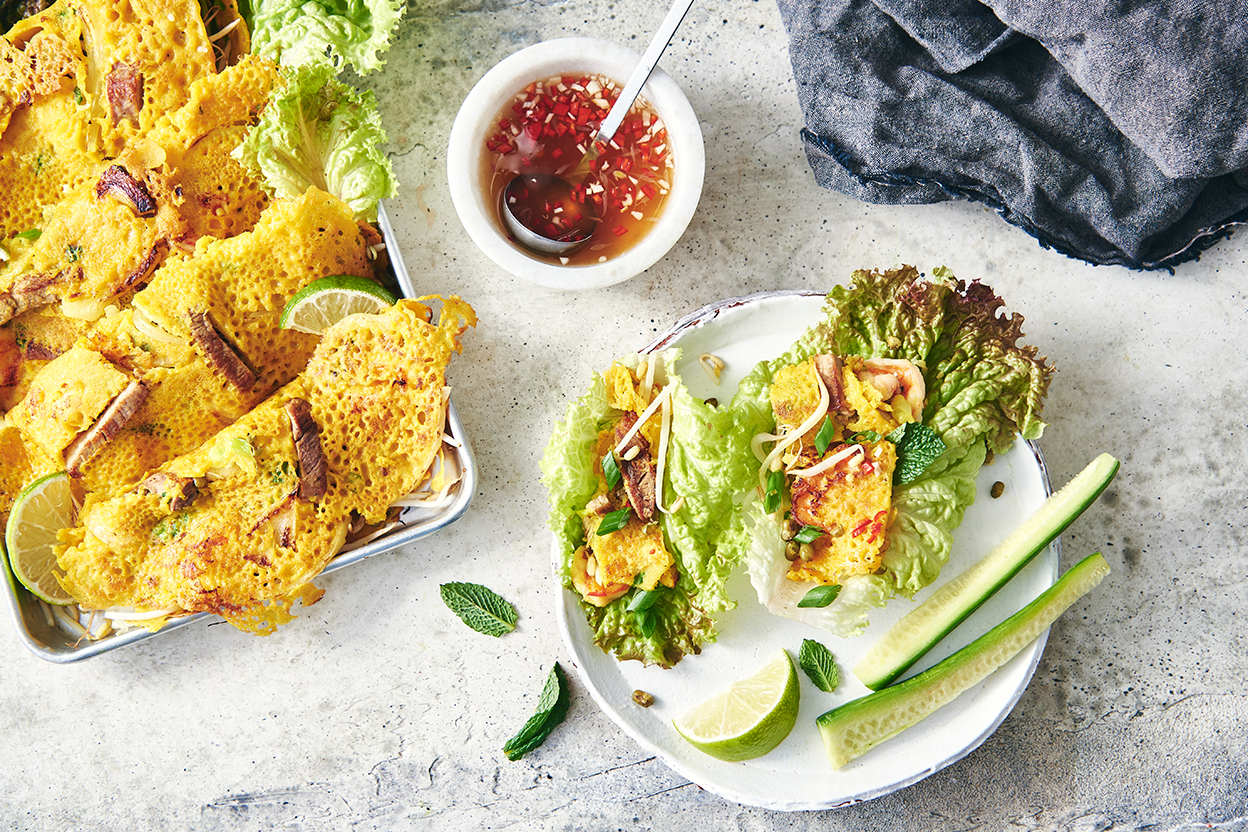 This recipe comes to us from Ha Nguyen and Ryan Tran, a mother-son duo featured in our Let Good Things Rise series. The savory rice flour crêpes (or pancakes) are stuffed with mung beans, shrimp, pork, and bean sprouts and pan fried until crispy. To serve, they’re wrapped in fresh lettuce and herbs then dipped in a sweet fish sauce. What results is a dish you can share as a party snack or at a casual dinner among friends.