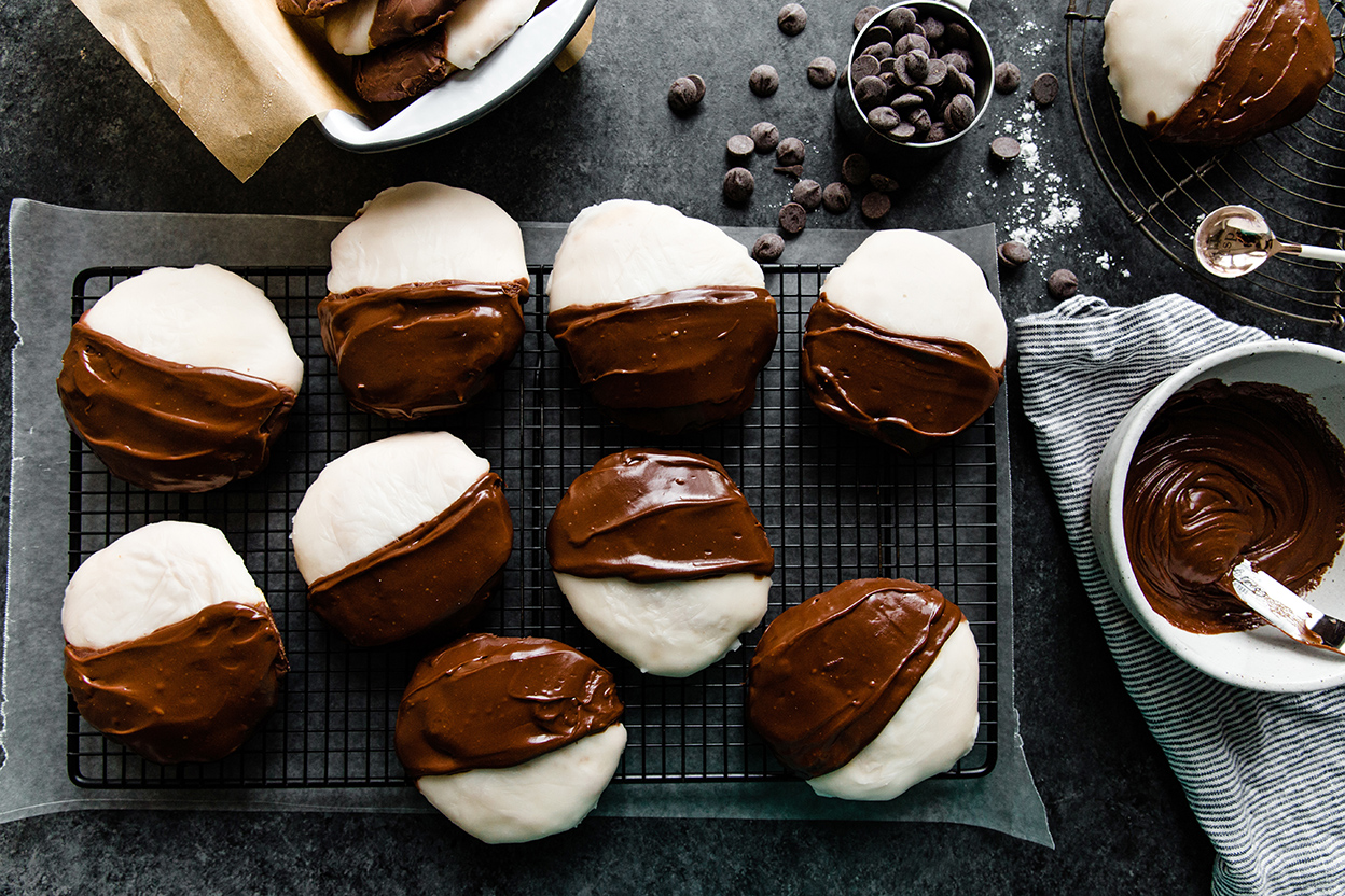 Set the black and white cookies back on the rack, and allow them to rest for about 30 minutes, till the icing is set.