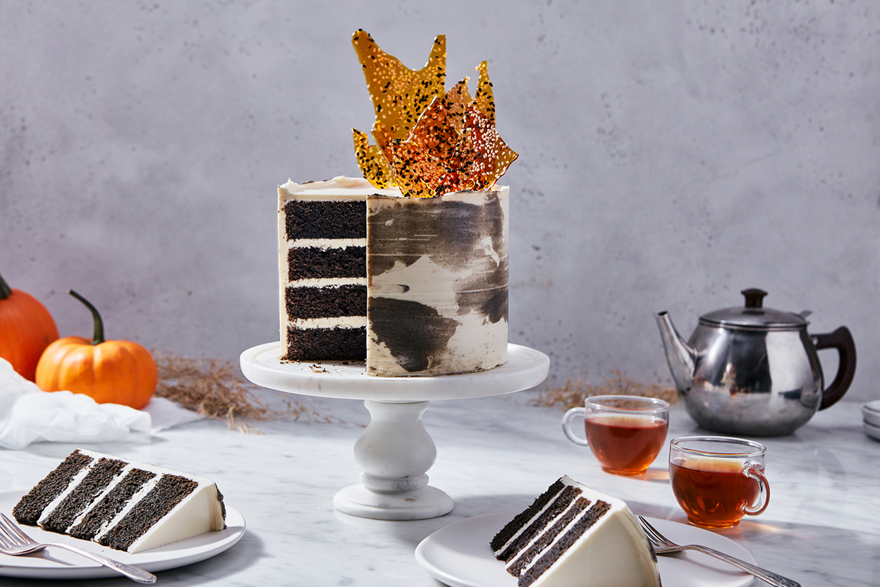 Finish frosting the cake with white and dark buttercream; garnish the top with shards of sesame brittle, if desired.