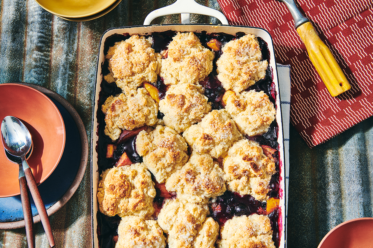 This lightly-sweetened, biscuit-topped fruit cobbler features two of summer's great fruits: peaches and blueberries. We recommend serving it warm, with whipped cream or vanilla ice cream. For best flavor, we also suggest waiting to bake the cobbler until these fruits are in season. However, using a pound each of frozen/thawed/drained peaches and blueberries will work in a pinch.