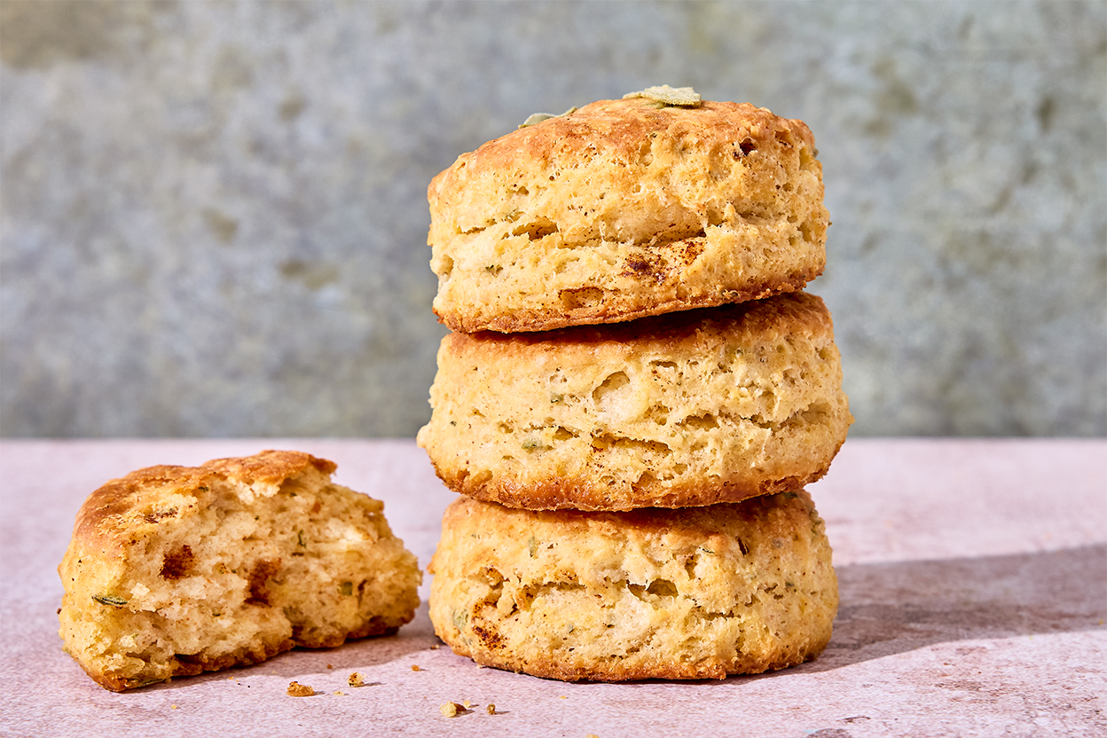 Bake the biscuits for 13 to 15 minutes, until they’re golden brown on top and around the edges. Remove the biscuits from the oven and brush the remaining reserved brown butter on top, being careful not to brush off the baked sage leaves. Serve warm.