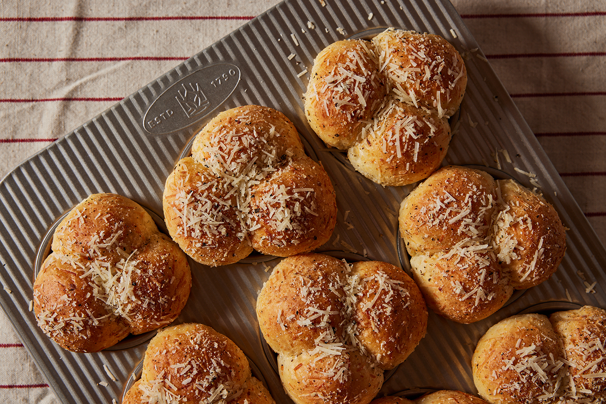 These pull-apart clover rolls are infused with the flavors of the classic Italian pasta dish cacio e pepe (which literally means “cheese and pepper”). The dough is flavored with Pecorino Romano and black pepper, then coated in more cheese and pepper both before and after baking for an umami-rich cheesiness and a tingle of heat in each bite. Eat these rolls alongside any meal — they pair especially well with pasta or a warm bowl of soup.
