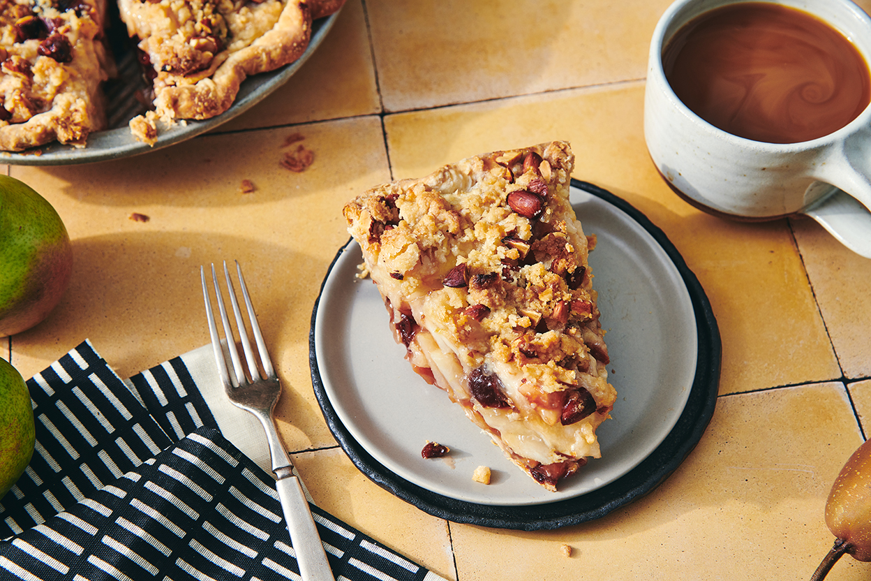 Move over apple pie, pear pie is ready to take the spotlight! Pears are a bright spot in the winter produce landscape, and they star alongside vibrant dried cherries in this pie with a crunchy almond streusel on top.