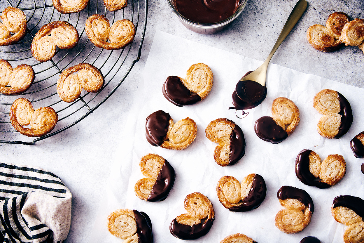 Remove the palmiers from the oven and transfer them to a rack to cool while you temper the chocolate. They'll crisp up as they cool.