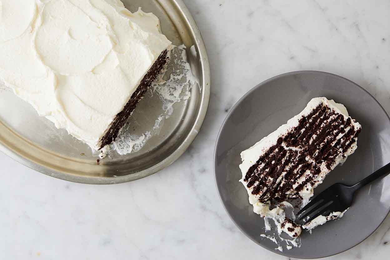 Cover the tops of the cookies with whipped cream, reserving any extra. Cover the pan and chill the cake for at least 4 hours, or overnight.