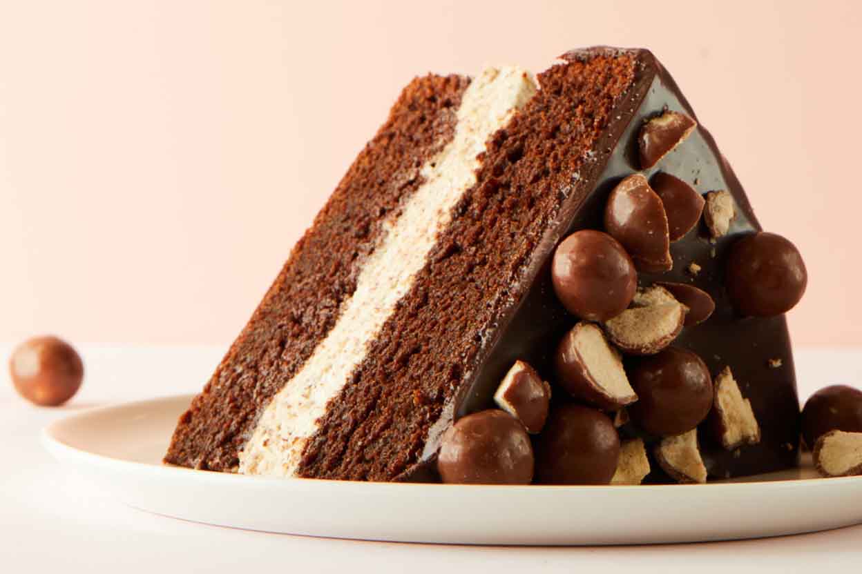Malt isn't just an old-fashioned soda-fountain treat — here it flavors a moist, tender cake, creamy filling, AND fudge glaze.