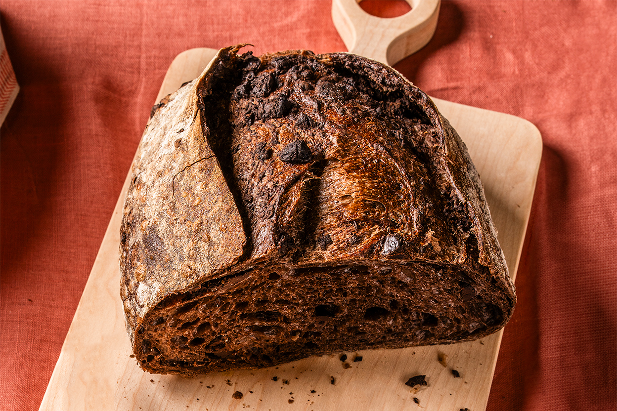 To bake the chocolate sourdough bread: Arrange racks in the center and bottom thirds of the oven. Preheat the oven to 475°F with a baking stone or steel on the center rack and an empty cast iron skillet (or a cake pan full of lava rocks) on the lower rack. If possible, adjust the stone and pan so that the skillet isn’t directly under the stone, making it easier for steam to reach the baking bread.