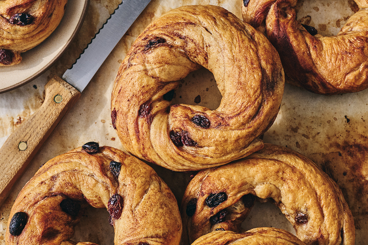 Unlike many cinnamon raisin bagels, which are cinnamon in name and hue alone, these have a cinnamon flavor you can see, smell, and taste. Their superior flavor is due to the distinct way the cinnamon is incorporated: It’s mixed with water, spread over the dough, then folded and chopped in so that it remains in visible streaks even after shaping. The raisins stay juicy and plump, thanks to a soak in hot water, and the use of High-Gluten Flour makes the bagels extra chewy.