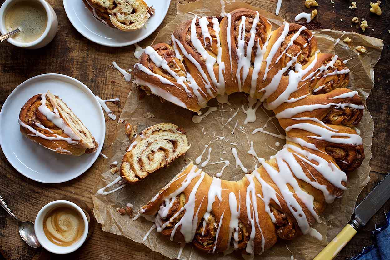 Think combination cinnamon roll and sticky bun in the shape of a ring: that's this satisfying tea bread, the epitome of comfort food. Reminiscent of any of various breakfast pastries you might find in the baked goods aisle at your supermarket, it's so much tastier: soft, fresh, and overflowing with butter, nuts, and of course cinnamon. Bonus: Despite its striking construction, it's much easier to make than you might think.