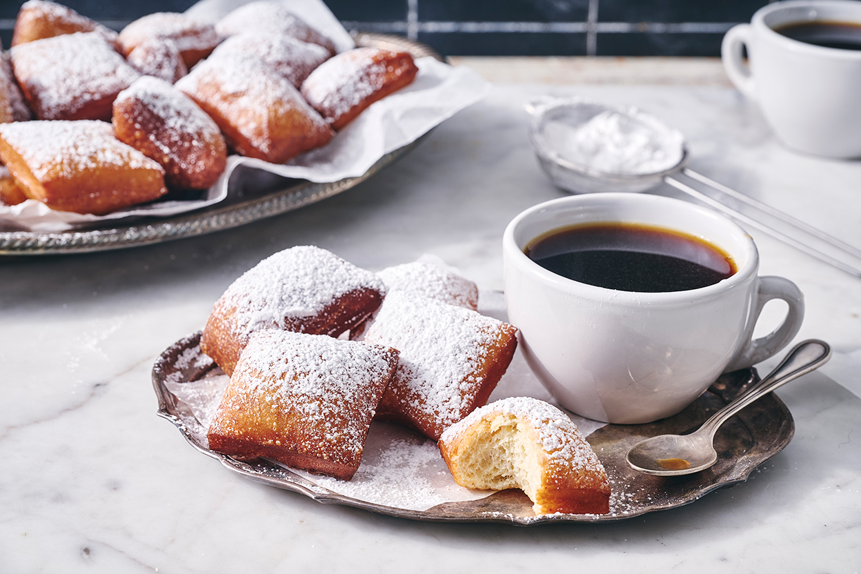Beignets are a signature yeast-raised breakfast treat native to New Orleans. They're dusted heavily with confectioners' sugar and traditionally paired with incredibly strong black coffee laced with chicory.