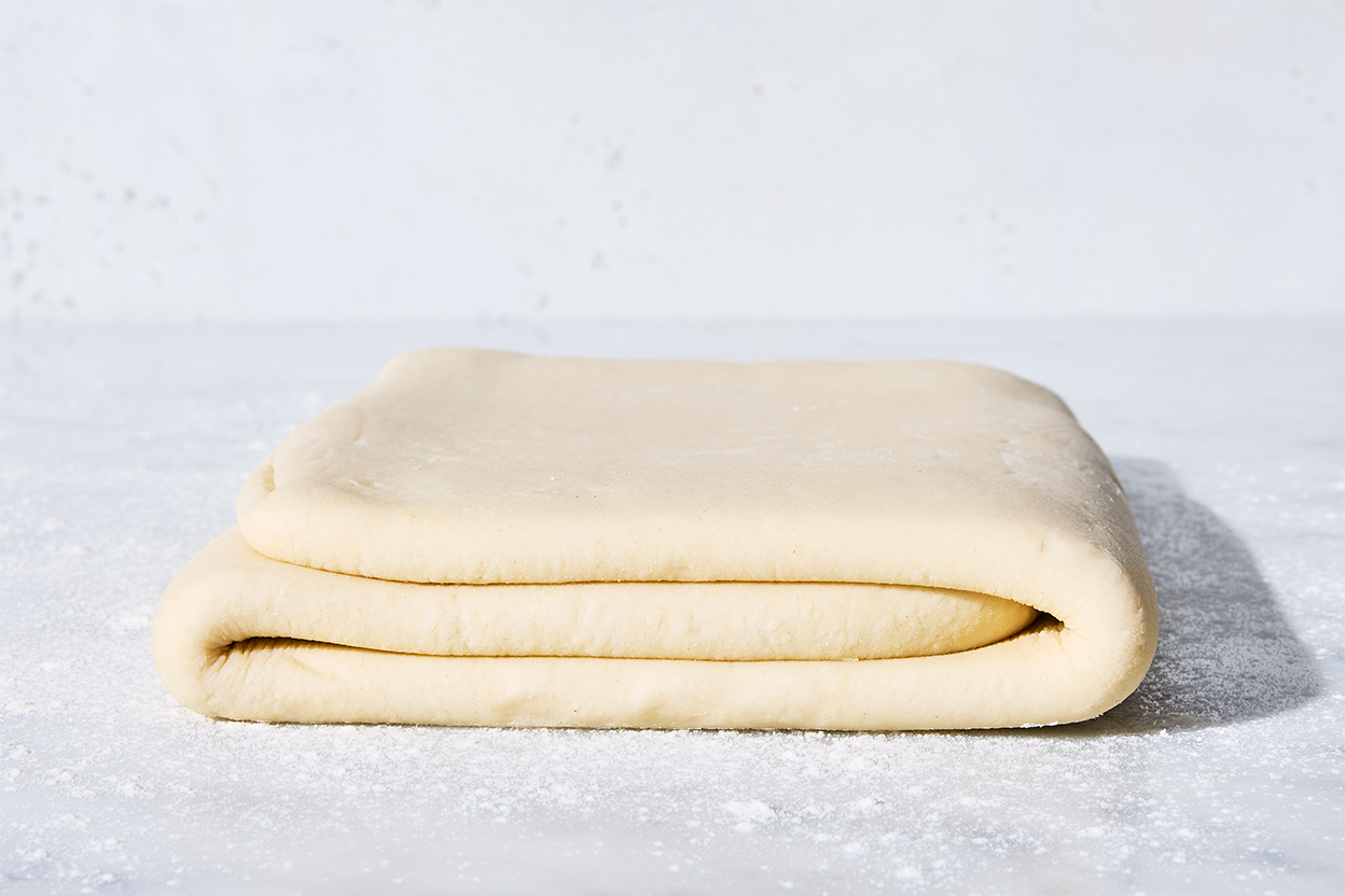 At this point, check that the dough packet is still cool to the touch using your fingertips: It should be slightly pliable and not resist being rolled. If it feels warm or resists being rolled, cover it with plastic or your favorite reusable wrap, place it on a baking sheet, and refrigerate for 15 minutes before completing the second turn. If the dough is still cool and does not resist being rolled, repeat the process of rolling the dough to a 20" x 10" rectangle, folding it like a business letter, and rotating it a quarter turn (90°), completing your second turn.