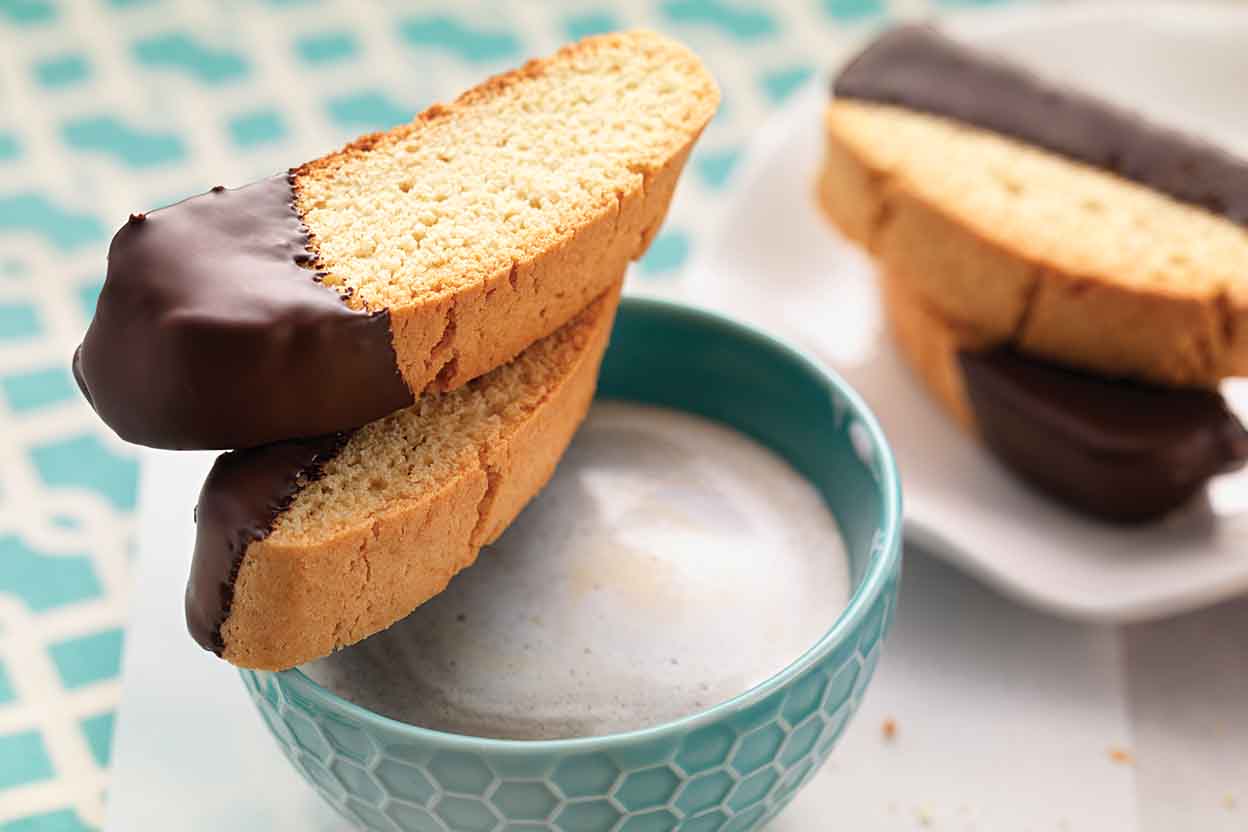 For added elegance and flavor, dip one end of each cooled biscotti in melted chocolate. Melt 1 cup chopped semisweet or bittersweet chocolate slowly and gently, either in a microwave, or in a double boiler set over a burner. Dip biscotti while the chocolate is still warm.