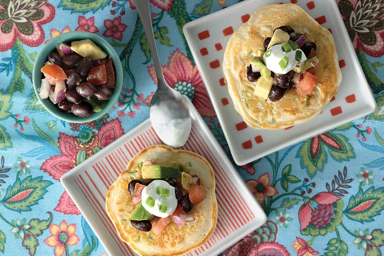 These savory little pancakes make great appetizers. Enhance their presentation by topping with black bean salad.