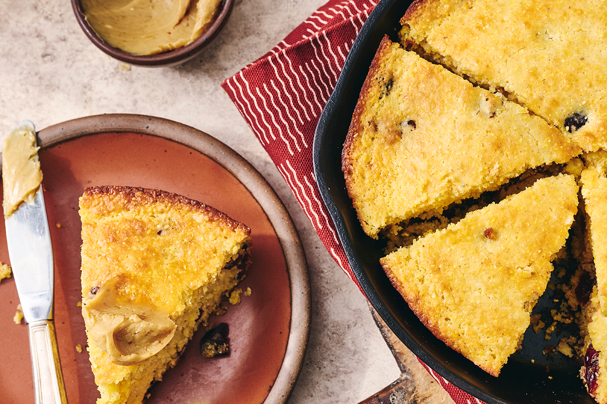 An 8" cast iron skillet is perfect for this go-to cornbread recipe, which we like to dress up with dried cranberries and slather with whipped molasses butter.