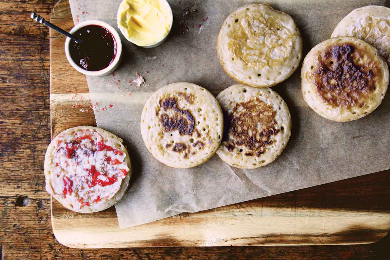 This traditional British teatime treat is midway between English muffin and pancake. Like an English muffin, it's full of holes, perfect for collecting rivulets of melted butter. But it's also moister and thinner – more like a small pancake. These are best enjoyed toasted, and spread with butter, jam, and/or clotted cream. Since their holes reach to the outside crust, there's no need to split them before toasting.