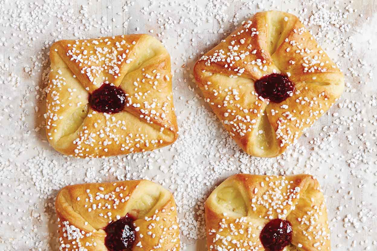 These pretty little Scandinavian pastry squares are adapted from a recipe by Beatrice Ojakangas, a wonderful baker and author of the Great Scandinavian Baking Book. With their bright red dollop of jam and sprinkle of Swedish pearl sugar, they'll dress up any holiday table.