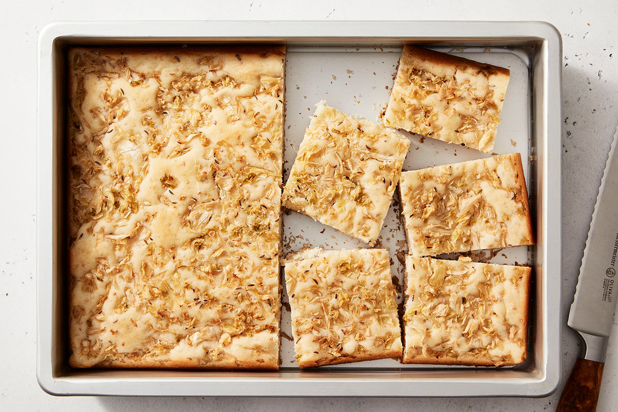 Grease a 9" x 13" pan and transfer the dough into it. Generously grease your hands and pat the dough out to cover the bottom of the pan. Sprinkle the sauerkraut evenly over the top, pressing it in lightly. Cover and let rise for 90 minutes, or until puffy looking. Toward the end of the rise time, preheat the oven to 375°F.