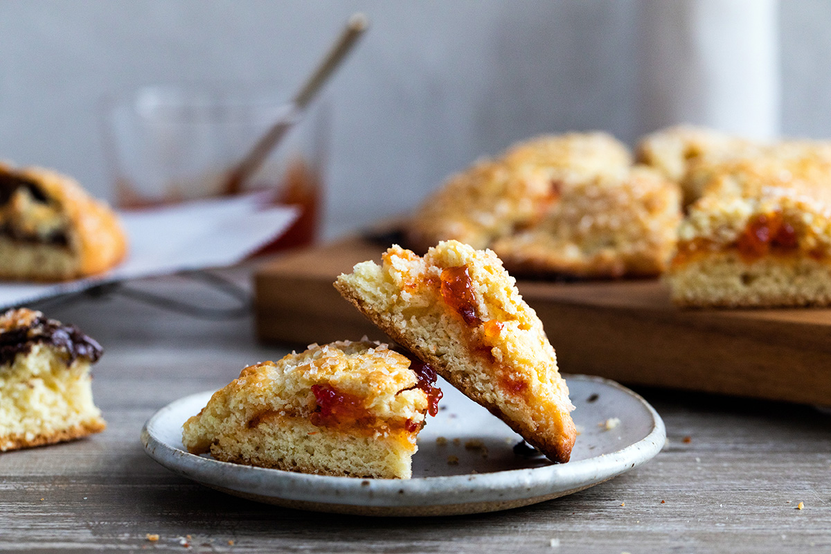 These tender scones are made by stacking two layers of dough with filling in between, creating scones where each bite includes a moist, tasty band of fruit preserves, caramel, sweetened cream cheese, or the filling of your choice — Nutella, perhaps?