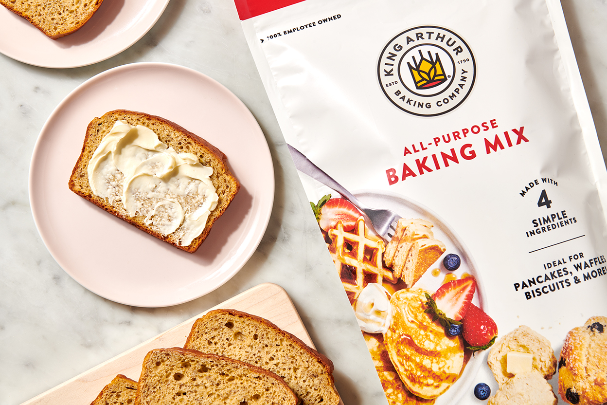 Made with a few pantry staples and our All-Purpose Baking Mix, this very easy banana bread takes only 15 minutes to stir together. The banana bread is moist, tender, and full of banana flavor – it’s sure to be an everyday favorite in many kitchens. Add chopped nuts, chocolate chips, or cinnamon if you’re looking to take this quick and easy banana bread recipe to the next level.