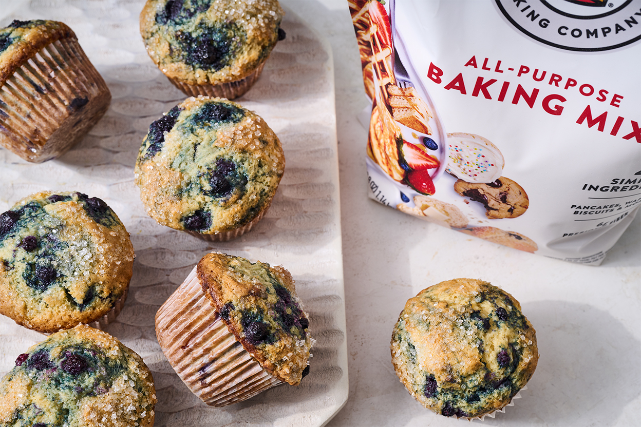 These easy muffins come together in an absolute flash, thanks to our All-Purpose Baking Mix. All it takes is two bowls, a whisk, and a few kitchen staples to make them! This small batch of muffins is a blank canvas: Be sure to check out the tips below to see how to customize the recipe with blueberries (as pictured), corn, or savory add-ins.