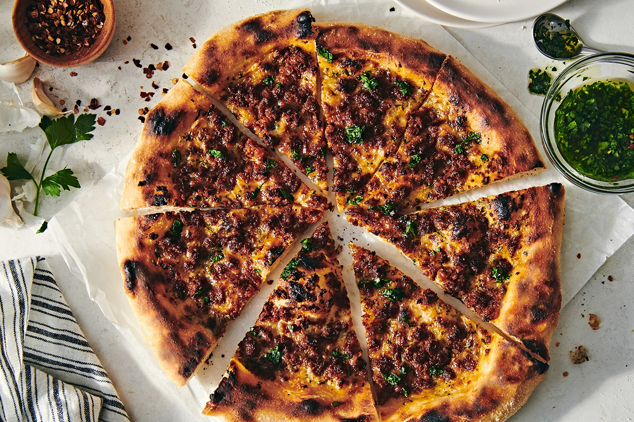 While your first pizza bakes, brush the second pizza with a light layer of parsley oil and top with the remaining vegan mozzarella and “chorizo.” Add a few spoonfuls of parsley oil on top, and repeat the baking process for the second pizza.