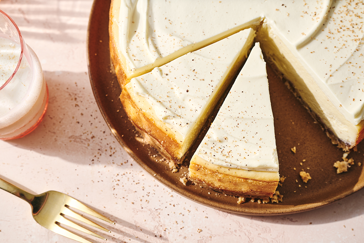 Eggnog’s rich flavors are an excellent match for the tangy creaminess of this celebratory holiday cheesecake.