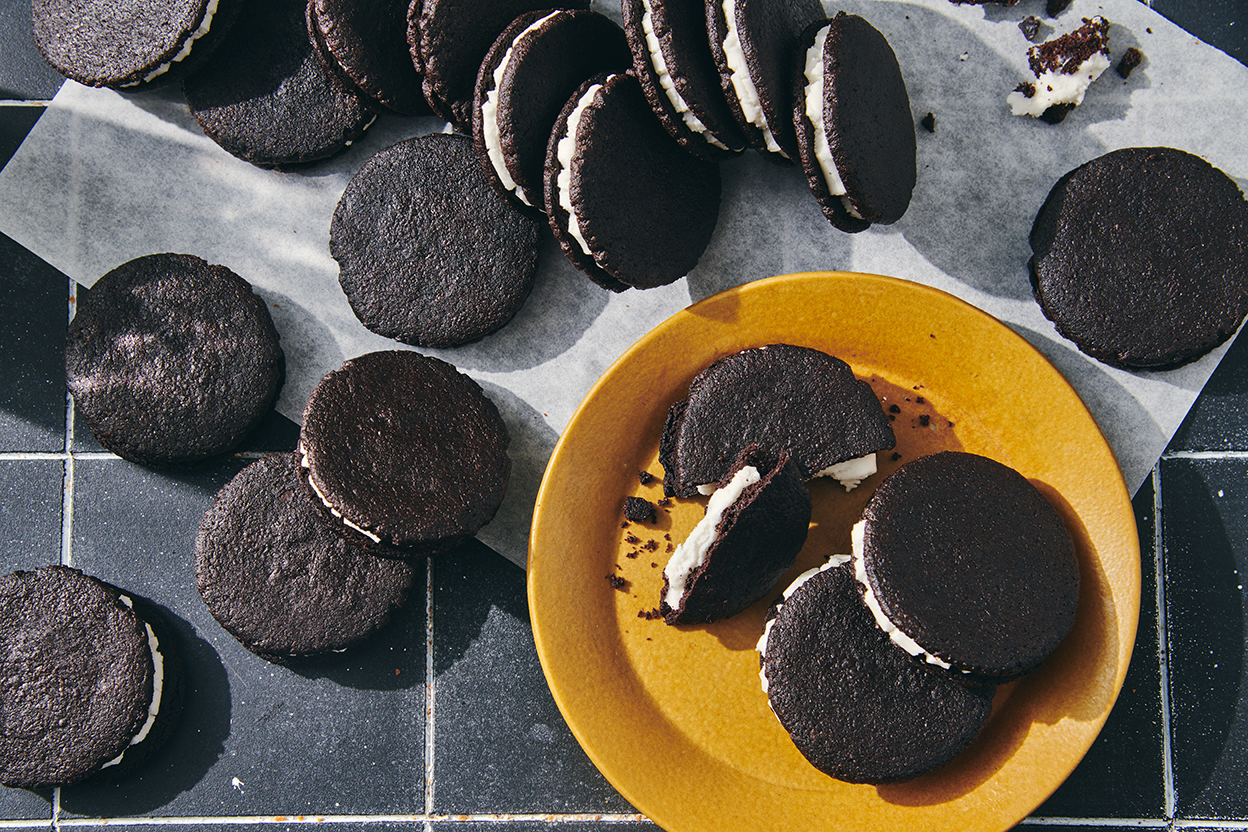 Place one level tablespoon filling in the center of one cookie; again, a teaspoon cookie scoop, slightly heaped, is perfect for this task. Place another cookie atop the filling, and squeeze to distribute the filling evenly. Repeat with the remaining cookies. Store in an airtight container.