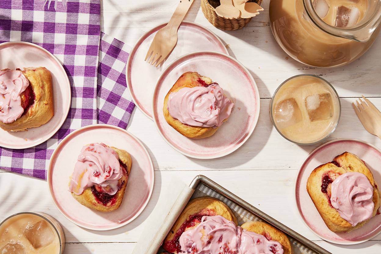To make the frosting: In a large bowl, use a wooden spoon or flexible spatula to beat together the cream cheese and confectioners’ sugar until smooth. Add the reserved sour cherry jam and the pinch of salt and stir to combine. Spread frosting over the warm buns and serve immediately or let cool to room temperature.
