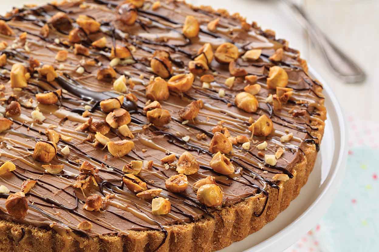 To serve: Transfer the tart from the freezer to the refrigerator 30 minutes before you want to serve it, to soften. Drizzle with caramel sauce, sprinkle with nuts, cut, and serve.