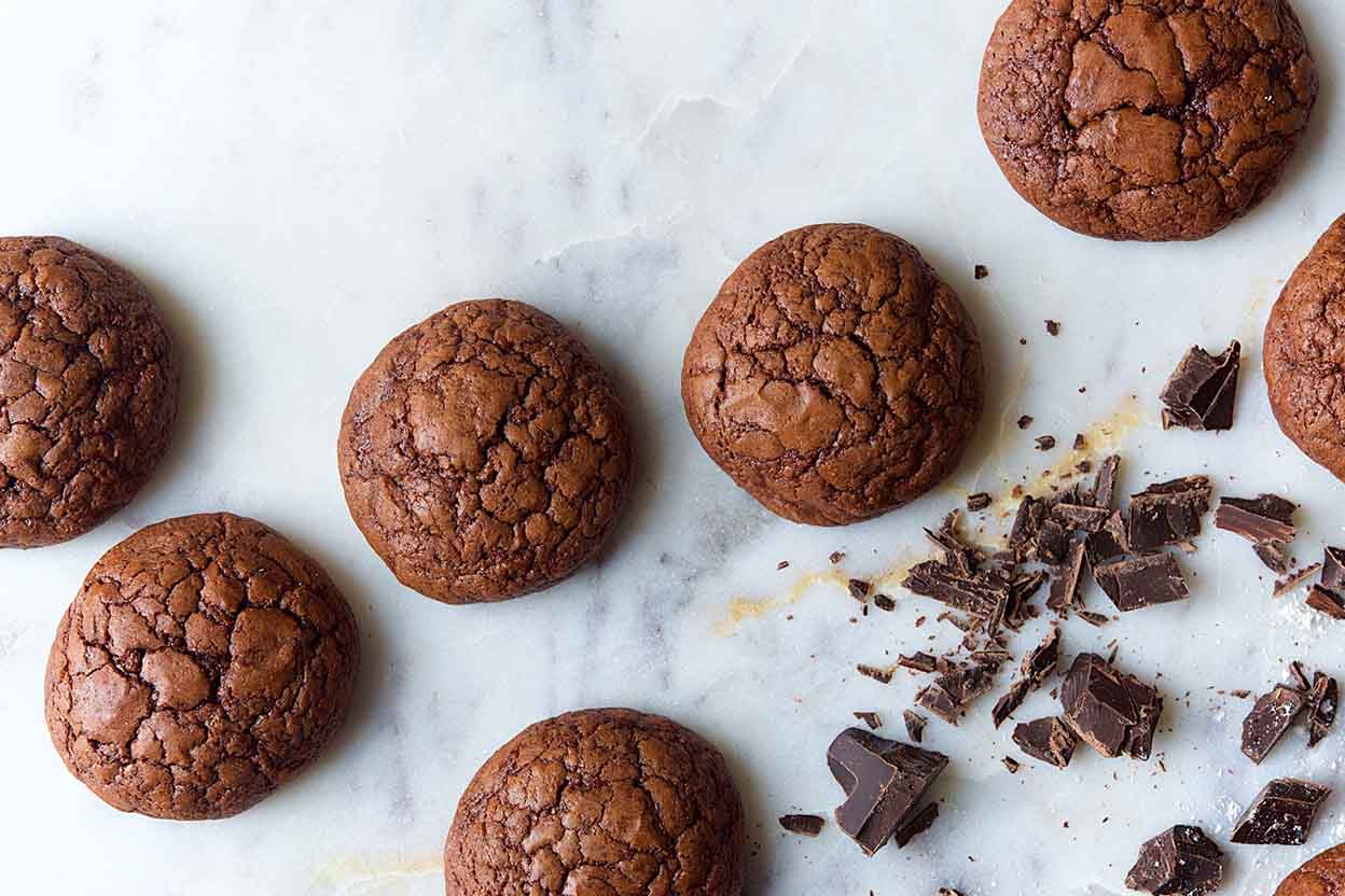 These soft, rich fudge cookies develop a shiny/cracked top surface as they bake. It's an interesting process; the cookies don't crack until just before they're done; and sometimes they develop large rivulets (like the ones pictured here), while at other times their surface is just a faint mass of tiny cracks. We've found that baking one pan of cookies at a time, on the middle rack, produces the most reliably "crackly" cookies.