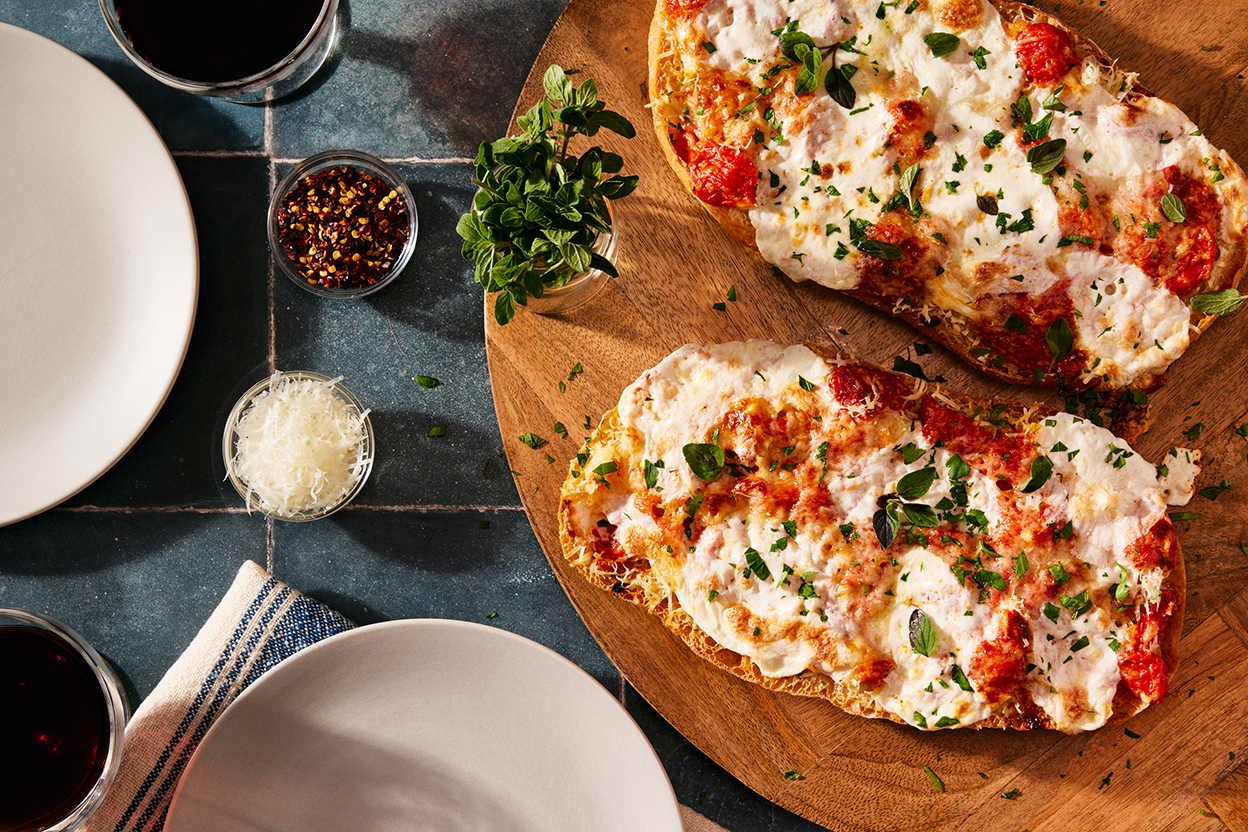 Brush about 1/4 cup (roughly 50g) of the garlic mixture onto each sliced bread. Then spread about 3/4 cup (roughly 96g) of the sauce on each bread, followed by 1/4 cup (about 25g) Parmesan on each. Finish the garlic bread pizzas by adding 4 ounces (113g) mozzarella to each; tear the slices into smaller pieces as needed to fill any large gaps. It’s OK, and even desirable, for some of the tomatoes to peek through.